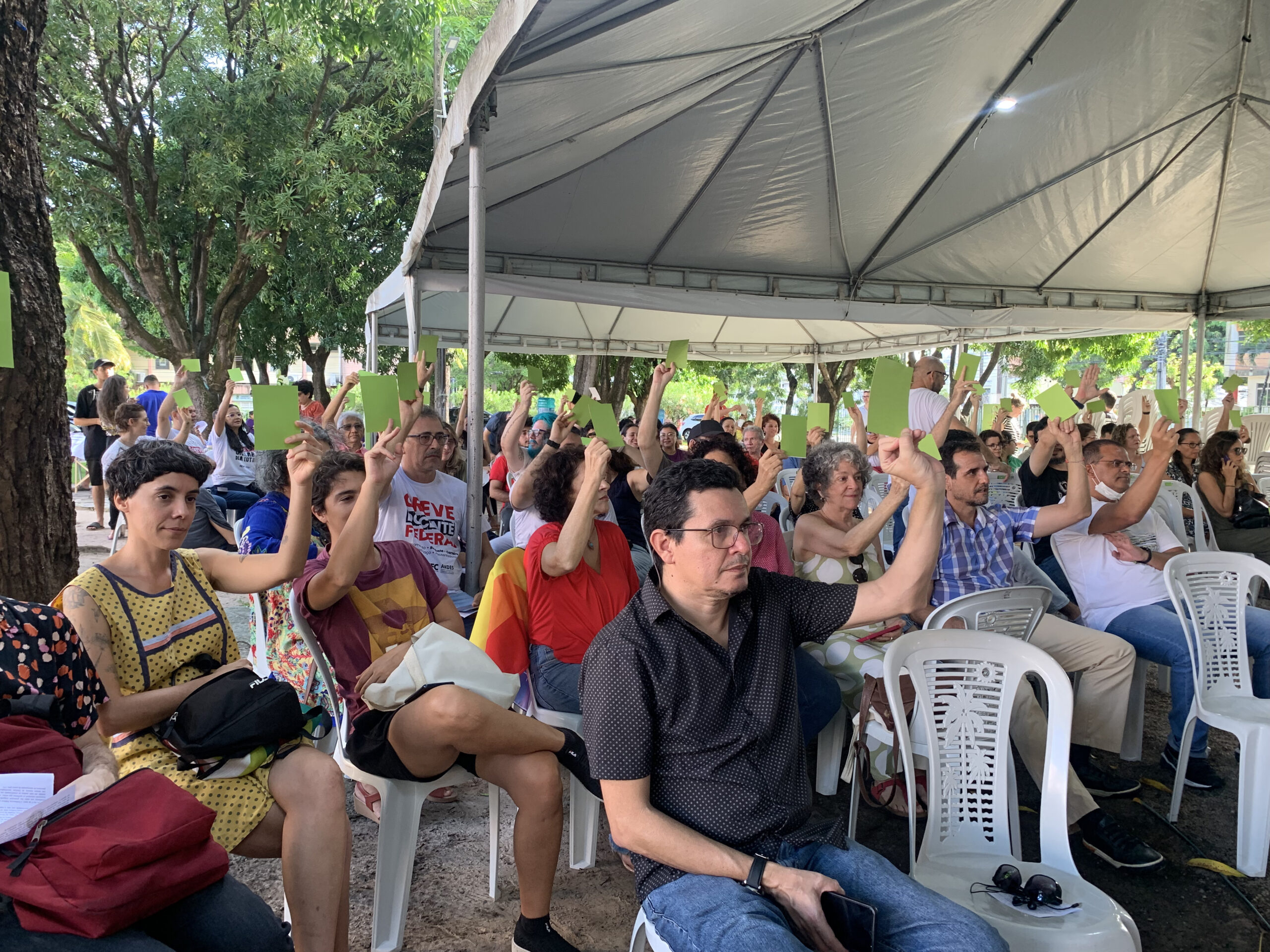 Docentes da UFC, UFCA e UNILAB rejeitaram ontem (16), em Assembleia Geral da ADUFC, a proposta apresentada no dia anterior (15) pelo governo federal na mesa de negociações com entidades sindicais. A decisão será encaminhada ao ANDES-SN e confirma a continuidade da greve docente nas três universidades federais cearenses. Professores/as também repudiaram a forma desonesta como o governo divulgou a proposta, induzindo a população a acreditar que foi oferecido um índice elevado de reajuste. Ao contrário disso, o governo manteve 0% de reajuste salarial para 2024 e propôs tímidas mudanças na evolução dos “steps” que pouco impactam a reestruturação do Magistério Federal. A assembleia ocorreu na tenda da reitoria da UFC, com transmissão para os campi do interior.