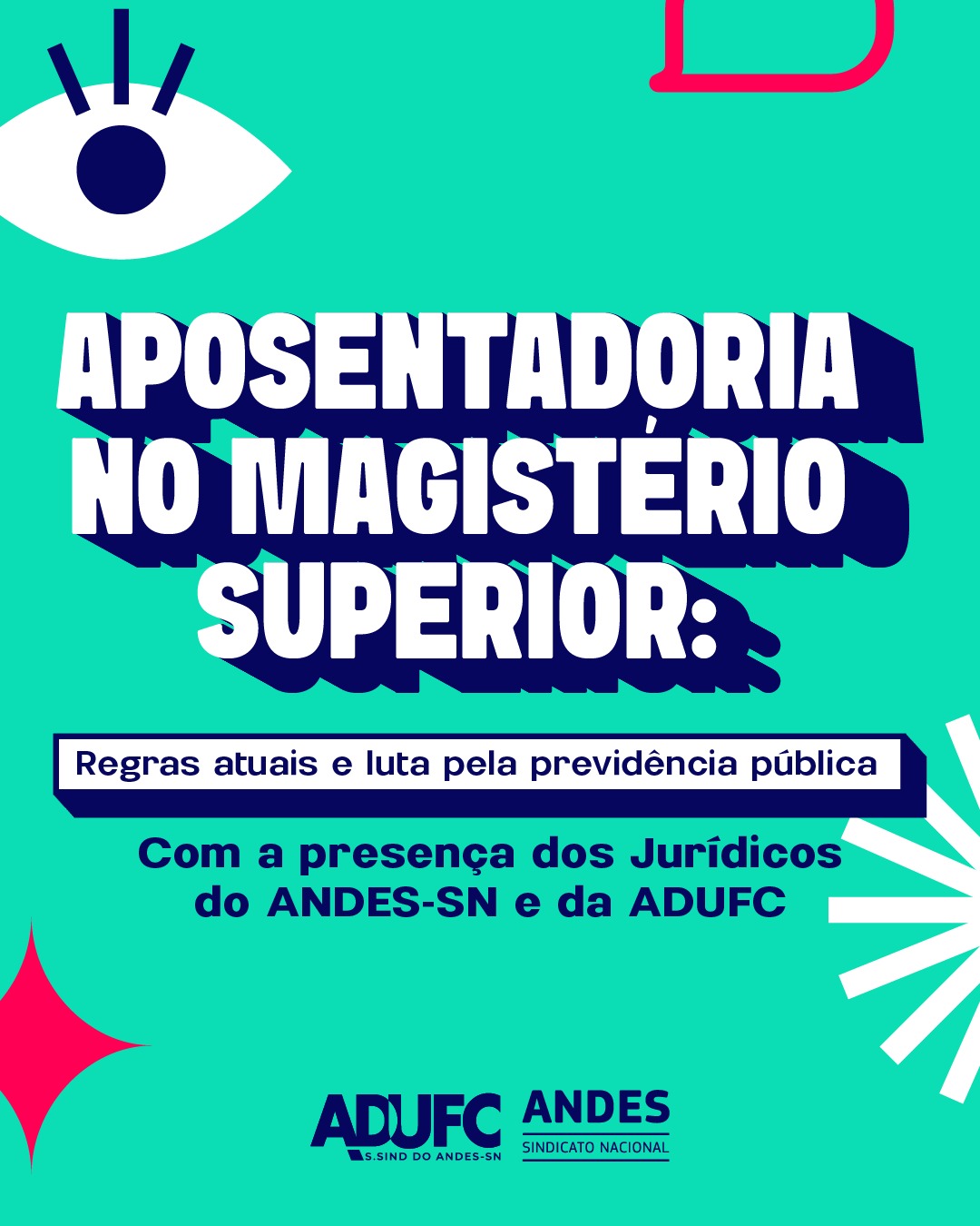 A ADUFC-S.Sind realiza, nos próximos dias 26 e 27 de novembro, o evento “Aposentadoria no Magistério Superior: Regras atuais e luta pela Previdência Pública” em Juazeiro do Norte e em Fortaleza. A atividade contará com a presença dos jurídicos do ANDES-SN e da ADUFC para debater as regras previdenciárias vigentes para o magistério superior público, discutir os impactos das reformas recentes e tirar dúvidas dos/as docentes sobre os regimes de aposentadoria.