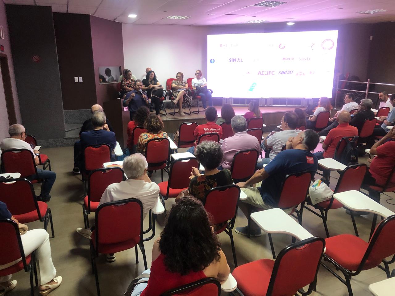 Na tarde desta quinta-feira, 29 de janeiro, o Fórum em Defesa do Serviço Público realizou uma importante plenária no auditório da ADUFC, reunindo diversas entidades sindicais e movimentos sociais para debater o tema “Eleições 2026: como defender os serviços públicos e as estatais?”.