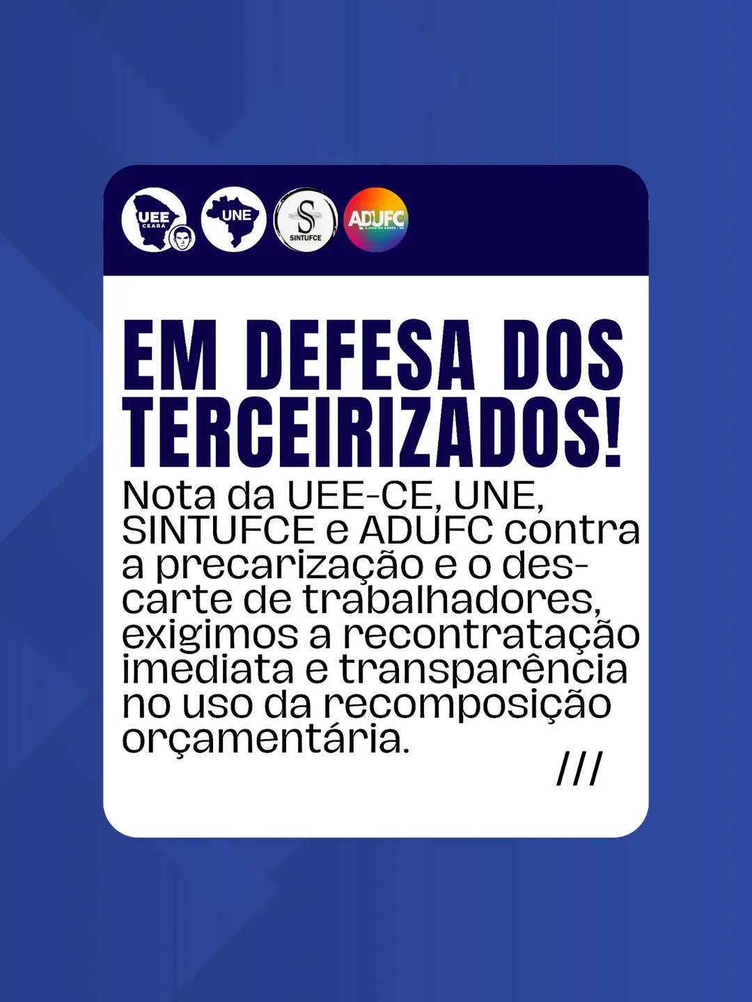 Na última quarta-feira (11), a ADUFC, juntamente com o SINTUFCE, UNE e UEE-CE, lançou uma nota de repúdio contra as demissões de trabalhadores e trabalhadoras terceirizados/as da Universidade Federal do Ceará (UFC).