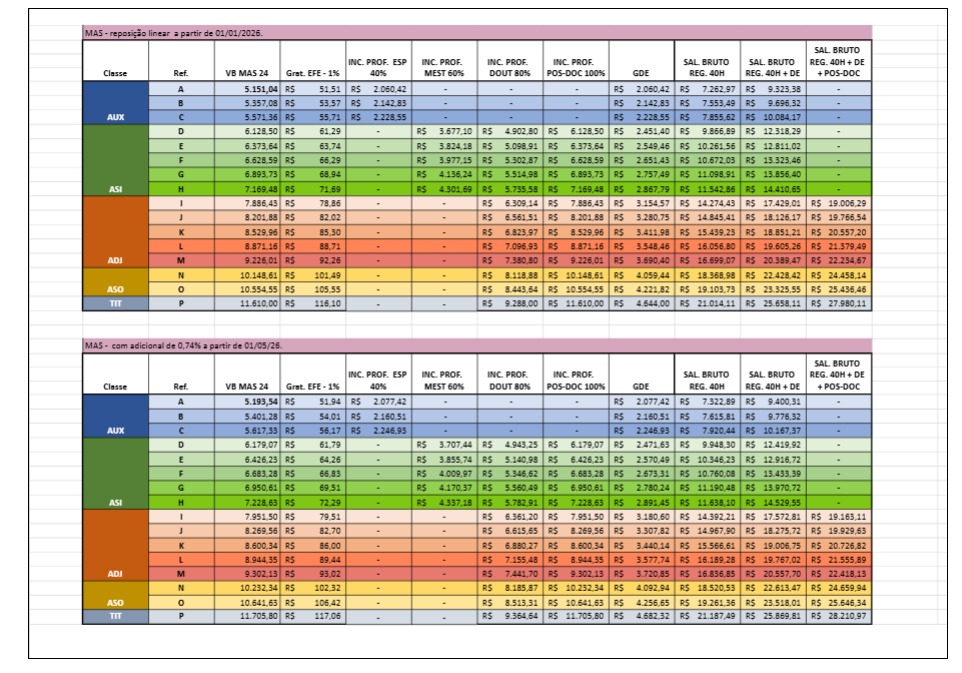 A Sinduece disponibilizou a tabela com os vencimentos atualizados para todos os níveis da carreira docente, que vão do nível A ao P.