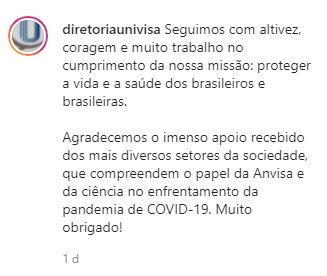 “A Anvisa está sempre pronta a atender demandas por informações, mas repudia e repele com veemência qualquer ameaça, explícita ou velada que venha constranger, intimidar ou comprometer o livre exercício das atividades regulatórias e o sustento de nossas vidas e famílias: o nosso trabalho, que é proteger a saúde do cidadão”, apontou.