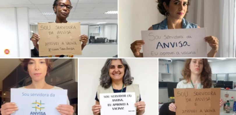 “Sou servidor da Anvisa e aprovei a vacina”, diz frase escrita em placa exibida por dezenas de trabalhadores. As fotos foram compiladas em um vídeo divulgado neste sábado (18) pela Associação de Servidores da Anvisa (Univisa). Confira.